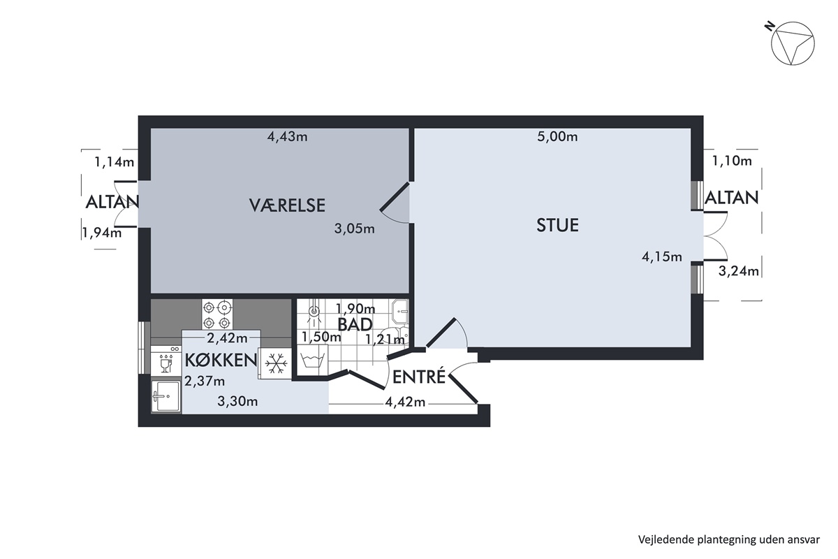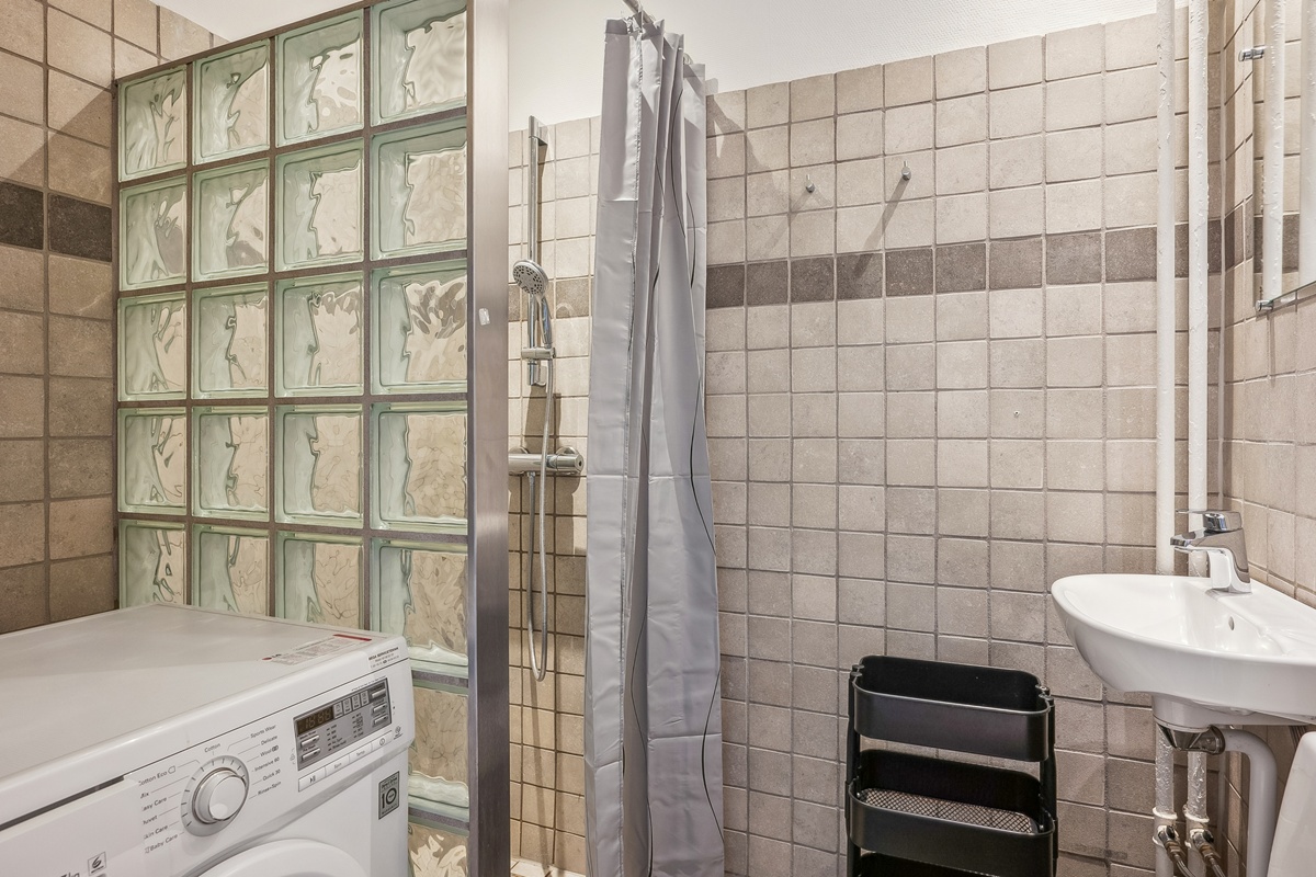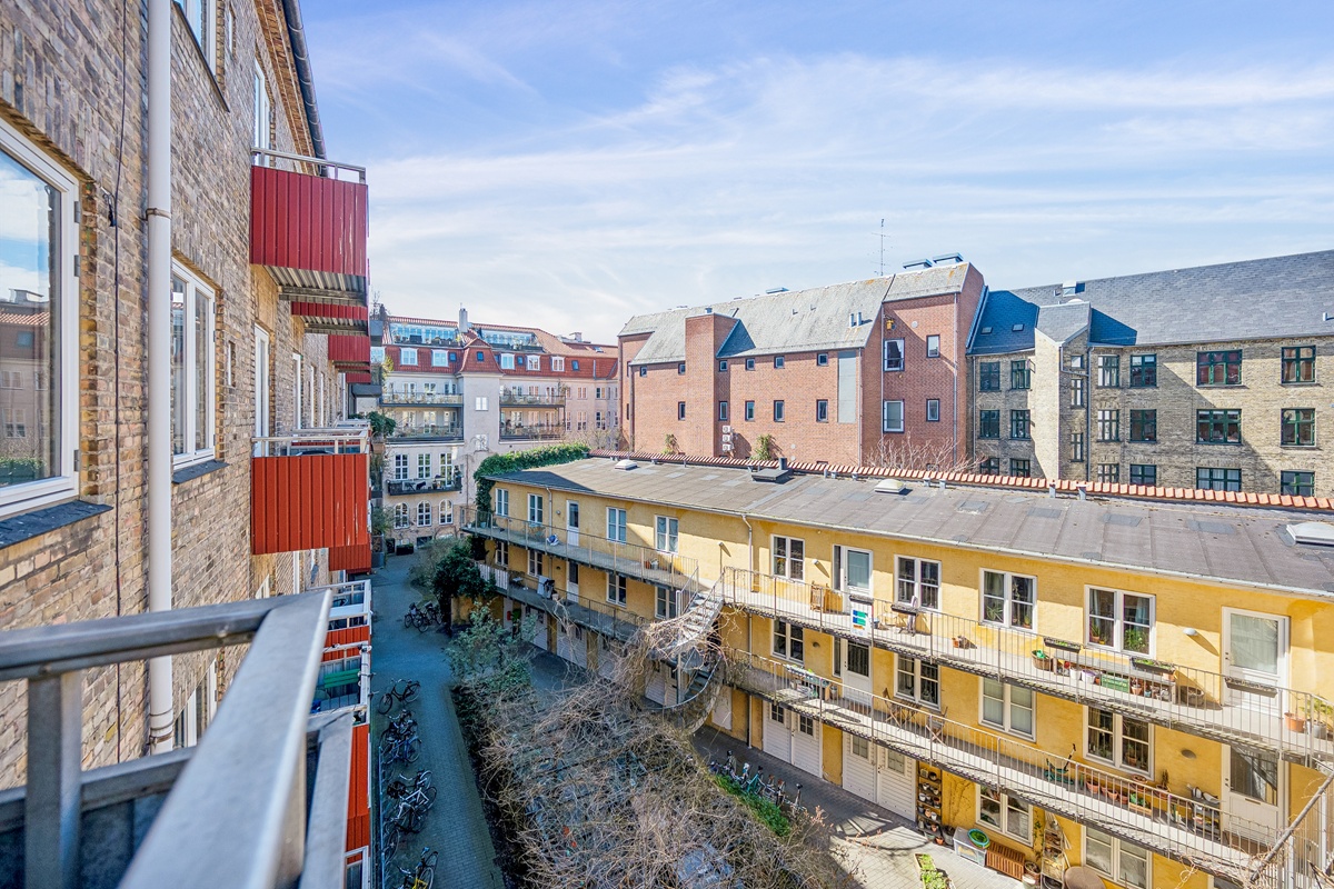 Badeværelset er funktionelt og har en bruseniche samt vaskemaskine, hvilket sikrer en nem hverdag. Fra stuen er der adgang til en altan, hvor man kan nyde frisk luft og udsigten over det livlige kvarter.