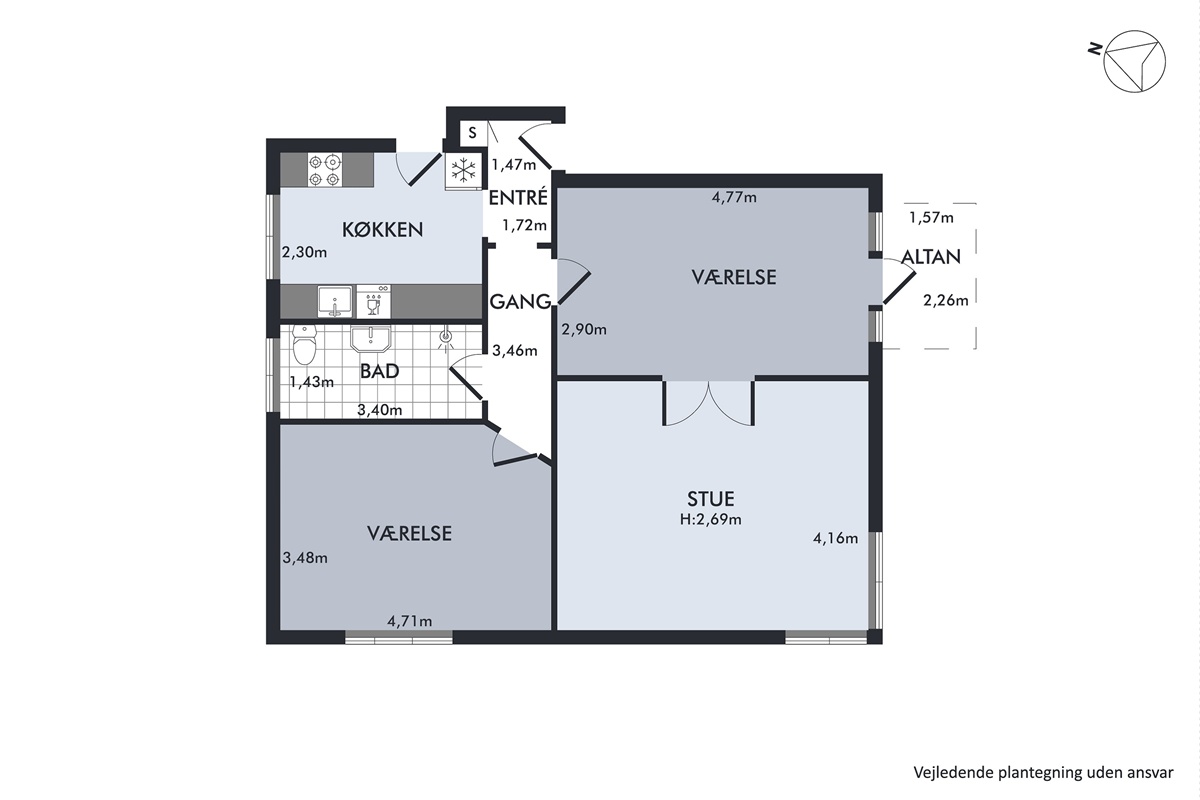 Indvendigt byder lejligheden på en god rumfordeling. Det ene værelse har udgang til en privat altan, hvor du kan nyde udsigten. De to soveværelser ligger praktisk placeret og har gode anvendelsesmuligheder, hvad enten det er til familie, kontor eller gæsteværelse.